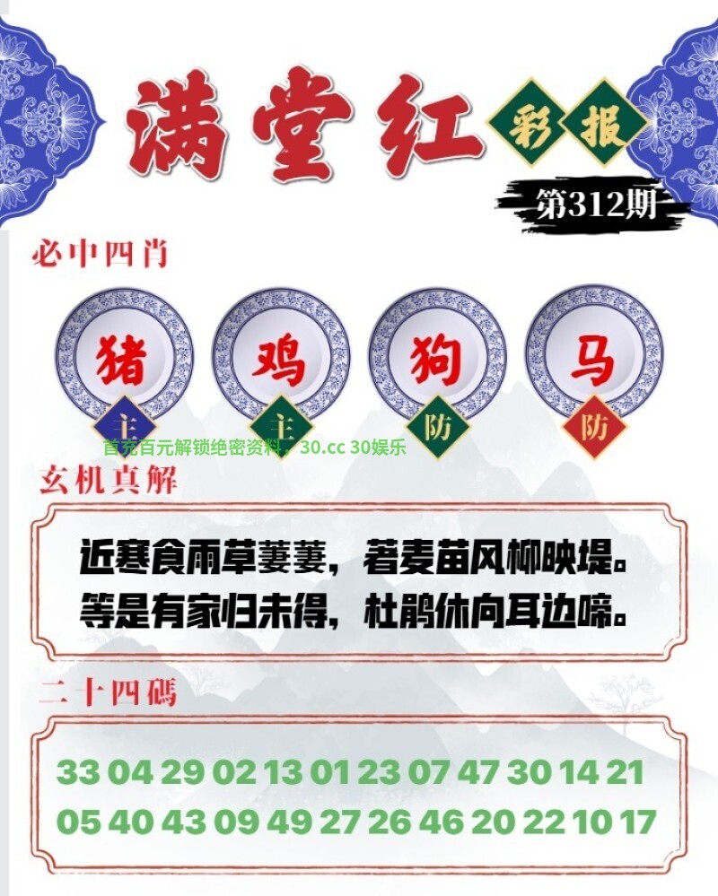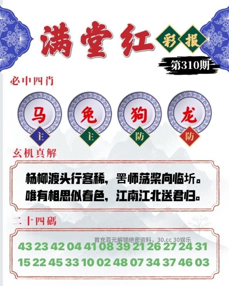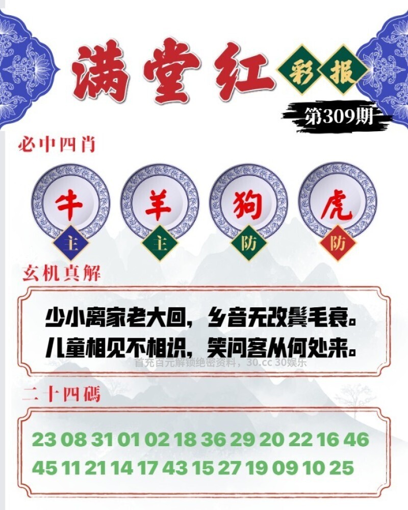 308期:*绝杀五码*→【05.10.17.30.46】开:兔39准